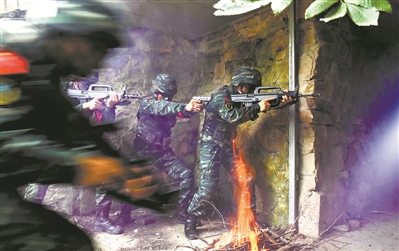 3名“暴恐分子”作案后持枪逃匿。“砰砰砰……”山林深处,突然传来密集的枪声。1名“暴恐分子”暴露踪迹后,与特战小队展开火力对峙,随后逃窜至一处废弃山洞负隅顽抗。