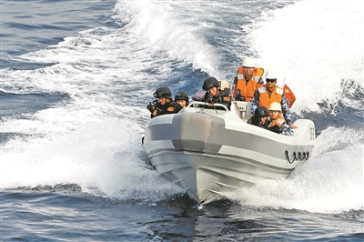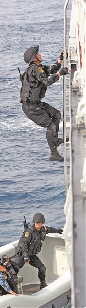 伴着一阵刺耳的警报声,海军第35批护航编队特战分队一场武力营救演练打响。空中战鹰盘旋警戒,海上两艘小艇搭乘数名特战队员快速抵近“被劫持商船”。挂梯、攀爬、翻越栏杆,特战队员动作干净利落,上船后随即展开舱室搜索、解救人质等课目演练。现场气氛紧张,惊心动魄,特战队员以迅雷之势果断突击,将“劫匪”一举歼灭,成功解救“被劫持商船”。