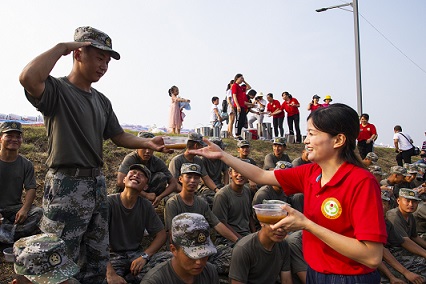 在湖口县长江干堤牛脚芜堤,当地群众为官兵送来饺子、绿豆汤、米粑。面对亲人般的关怀和问候,战士们备受感动。