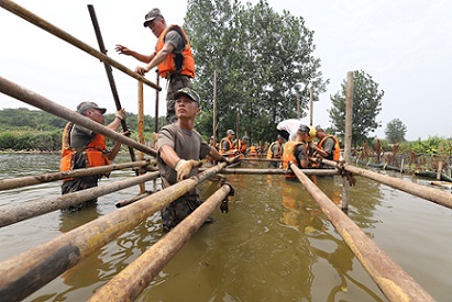 图为抗洪官兵为受灾地区搭建“临时通道”。李孟潇 摄