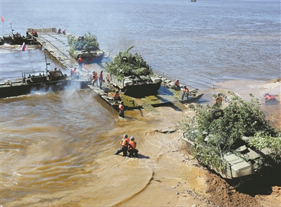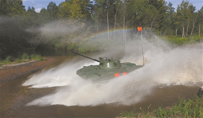 8月25日,“空降排”项目第二阶段战车单车赛展开激烈角逐,首次使用俄方战车的我军参赛队快速通过浅滩障碍。