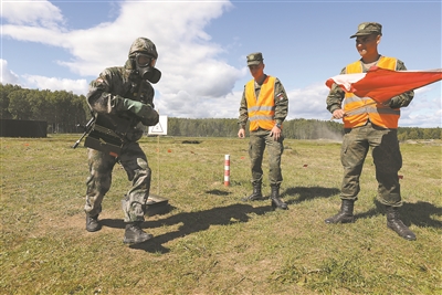 “安全环境”项目比赛前,我军参赛队员(左)进行单组赛适应性训练。傅道永摄