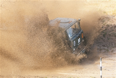 8月27日,在“汽车能手”项目接力赛中,我军参赛队员驾车通过泥坑路段。王世民摄