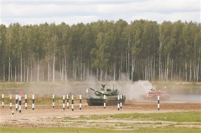 9月1日,在“坦克两项”项目半决赛中,我军参赛队703车组在赛道上疾驰。