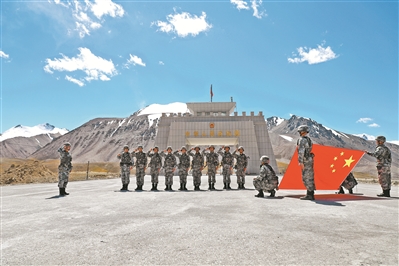 近日,新疆喀什军分区红其拉甫边防连组织即将退役的士兵进行告别国门仪式。图为守边战士面向国旗庄严宣誓,他们纷纷表示,到地方后会续写军人新风采。李小龙摄