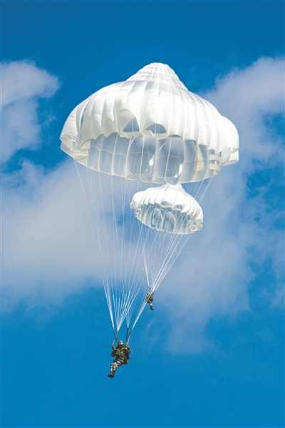 飞抵预定空域,在抗“蓝军”反空降火力掩护下,装备物资首先投放,全副武装的学员紧随其后实施集群伞降,朵朵伞花在天空竞相绽放。