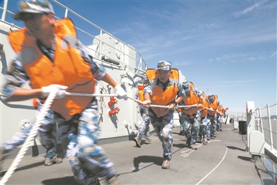 演训不避险,紧贴实战练。几天时间里,编队训练全程融入战术背景,立足实战需要,先后完成主炮对海射击、副炮对空射击、实射火箭深弹、编队航行补给占位、营救落水人员等20多个课目训练。