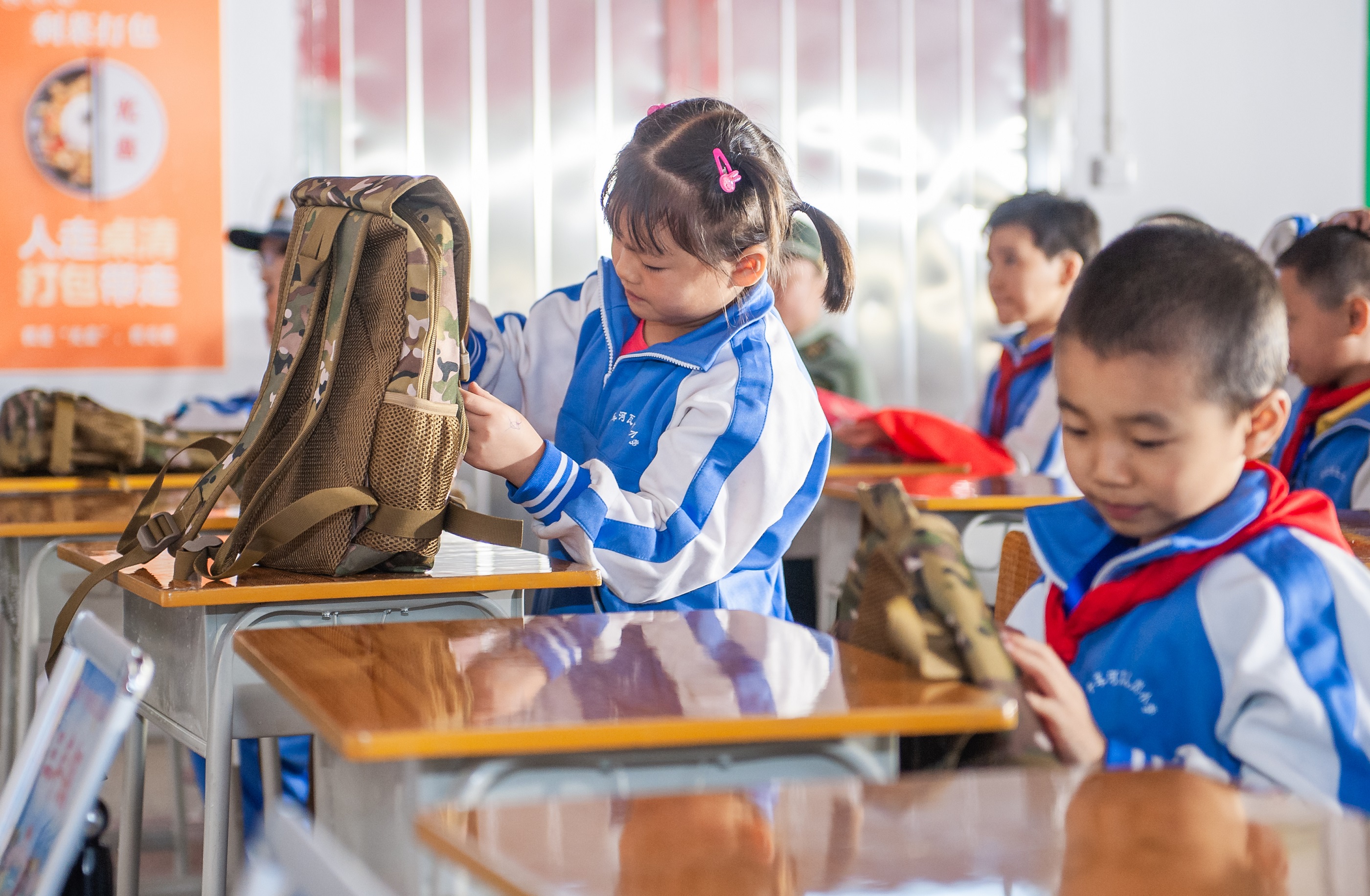 图为瓦儿岗小学学生开心地打开迷彩小书包。彭三珊 摄