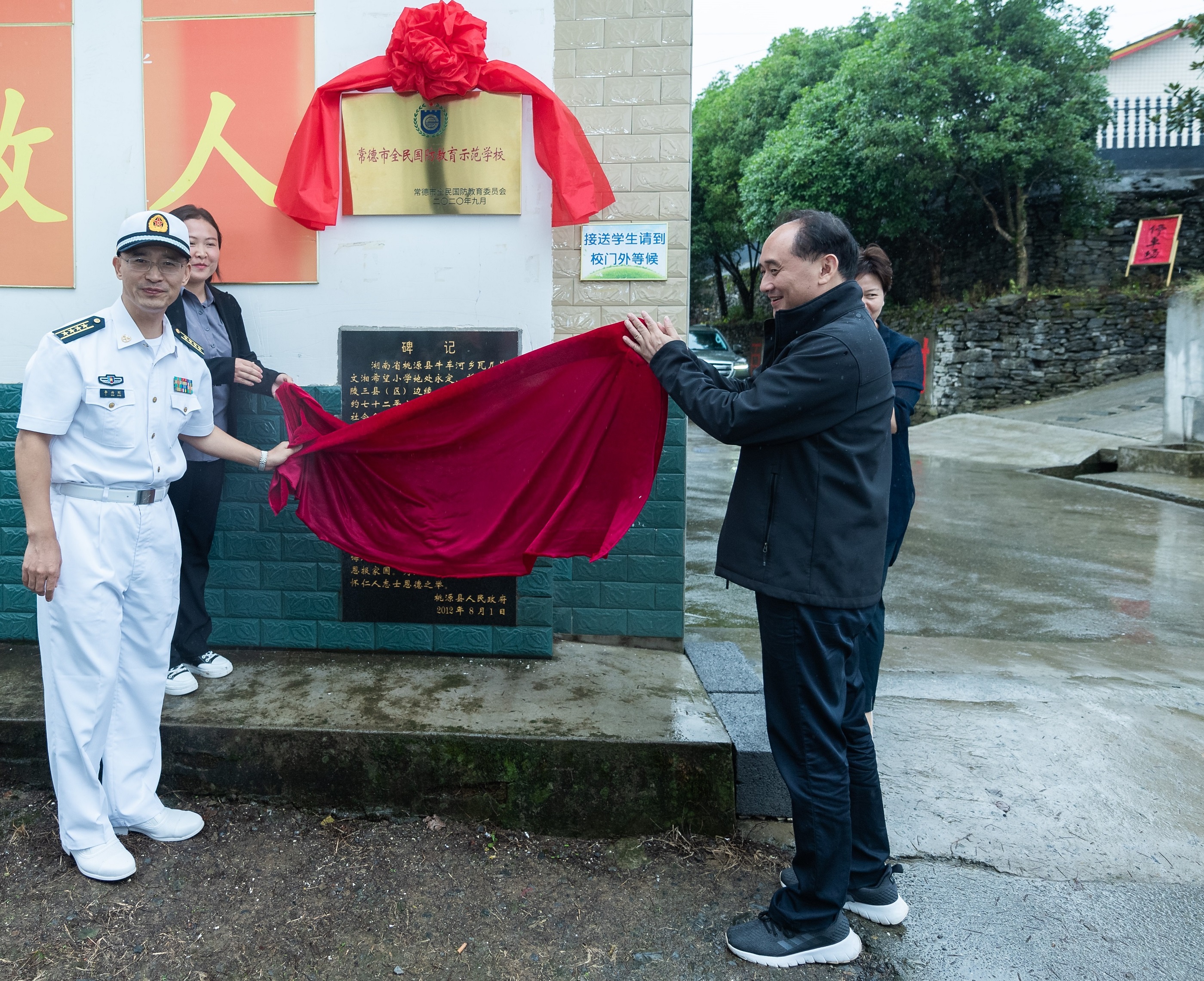 图为军地领导共同为国防教育示范学校揭牌。彭三珊 摄