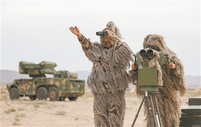 机动途中,“敌情”不断,险象环生。官兵们克服大漠行军风沙漫天等不利因素,临危不乱,沉着应对。部队刚刚抵达预定阵地,就接到“敌”侦察机和武装直升机来袭的空情预警。导弹分队与火炮分队立即展开火力装备,投入战斗。