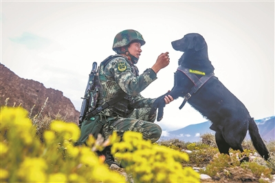 图⑤:中士李江龙在巡逻途中照顾出现高原反应的军犬“吉普”。
