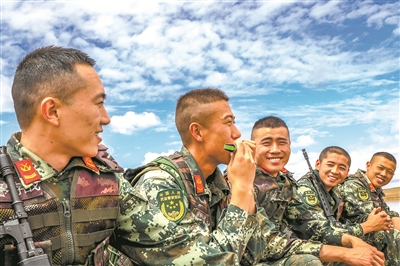 图④:休整时,下士赵发(左二)吹奏口琴为战友们缓解压力。
