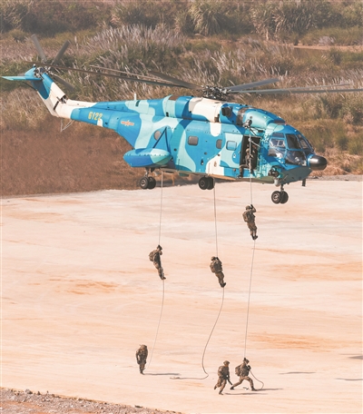 铁翼飞旋,黄沙漫卷。突击队员在“敌”左右两翼,多方向、多批次快速实施索降和机降。
