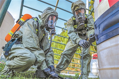 12月上旬,武警广西总队机动支队紧贴任务实际,组织防化分队围绕快速出动、有害物质侦检、战场洗消等内容展开防化应急演练,提高官兵应对各类突发情况的综合处置能力。图为对“泄漏”罐体进行封堵。 余海洋摄影报道