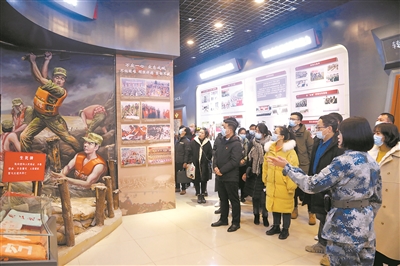 12月25日,空降兵某旅与驻地高校联合开展军事日活动。一大批高校辅导员走进军营,通过参观旅史馆、观摩官兵训练等活动,增强了国防意识和爱国拥军的热情。图为旅史馆讲解员为大家讲述该旅参加’98抗洪的故事。陈峥 摄