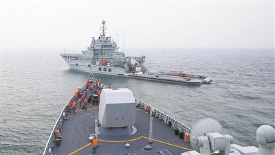 时值寒冬,海上风力强劲。抵达某海域后,齐齐哈尔舰模拟遭受“敌”袭击失去动力,编队即刻展开拖带训练。相关舰船部署人员迅速到达指定位置,各司其职,备便工具器材,听令收放拖缆。闻令而动,官兵凭借过硬素质,通过密切协同,成功完成拖带任务。