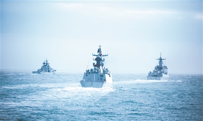 隆冬时节,东部战区海军某驱逐舰支队组织舰艇编队展开实兵对抗训练,提升部队遂行任务能力。 李宇 摄