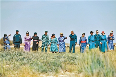 图②:官兵和草原牧民感受飞播带来的生态变化。