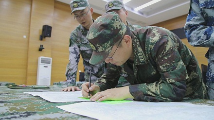 图为李曦(中)以图上作业形式与战友进行战法训法研究。李元昊 摄