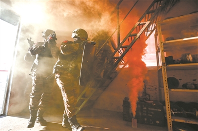 前不久,武警上海总队某支队从细节入手展开新一轮反恐训练。图为突击队员反复研究如何利用烟雾弹掩护突入楼内。李岩摄
