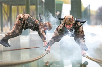 模拟战场环境爬越索桥。