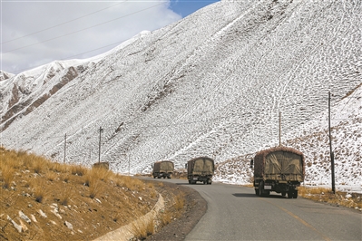 急行110公里,车队来到库地达坂。车窗外,一边是千仞绝壁,一边是陡崖深谷。“库地达坂是新藏线上的第一个冰雪达坂,地势险要……”驾驶员话音未落,一块石头便从山上掉落到车旁,所幸有惊无险。