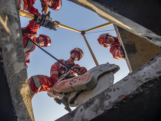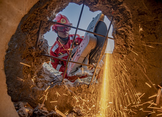 图为救援分队官兵采取安全破拆开辟救援通道。
