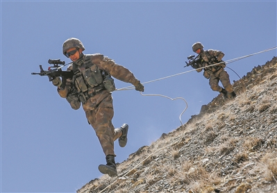 车队疾驰30公里后,到达一片陌生地域。“发现‘暴恐分子’,实施抓捕!”连长杨鹏宾一声令下,各战斗小组迅速投入战斗。队员们攀登滑降、隐蔽接敌,兵分多路实施围剿,成功制服“暴恐分子”。
