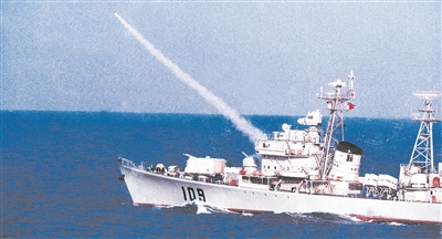 驱逐舰发射对空导弹拦截“敌”巡航导弹。