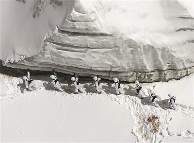 侦察队员不惧困难,向冰川地带徒步行军。