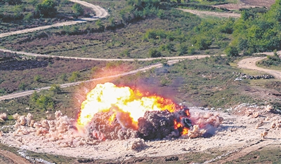 完成首轮打击,战机迅速跃升,大机动脱离直插云霄。数分钟后,战机再次进入攻击航线。到达最佳攻击阵位,飞行员果断按下发射按钮,两枚炸弹脱离战机后落向靶标,地面瞬间腾起一团火焰和气浪。