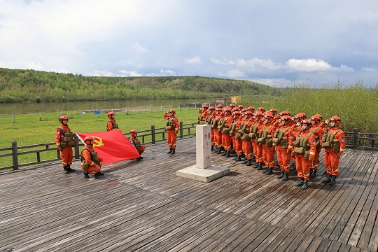 “七一”前夕,内蒙古森林消防总队大兴安岭支队奇乾中队一场综合灭火演练刚刚结束,“守夜·守望”主题党日活动随即在演兵场展开。这是他们开展党史学习教育的生动写照。“身在最北疆,心向党中央!”30余名党员高举右手,豪迈誓言在林海上空久久回荡。