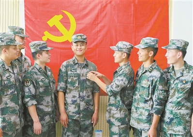入伍以来,下士刘卫(图右四)写了4次入党申请书。在中国共产党建党百年之际,刘卫终于圆了入党梦,戴上了党员徽章,成为第83集团军某旅的一名新党员。贾方文摄