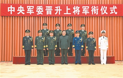 晋衔仪式在嘹亮的军歌声中结束。随后,习近平等领导同志同晋升上将军衔的军官合影。