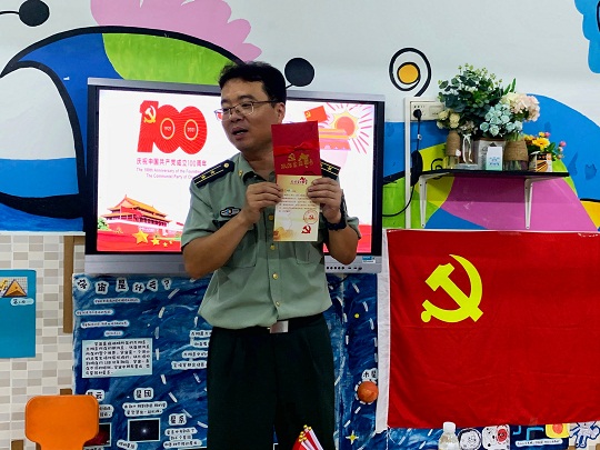 海口军事法院第一审判庭庭长刘琳通过展示党旗、党徽等实物,帮助孩子们加深对党旗和党徽的认识,引导他们传承好红色基因、做小小追梦人;通过教唱革命歌曲,讲解小萝卜头、抗日英雄王二小、慷慨赴死刘胡兰等红色故事,让孩子们了解革命英雄的牺牲奉献精神。