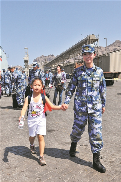 2015年也门撤侨行动中,郭燕手牵一个小朋友上舰回家。熊利兵 摄