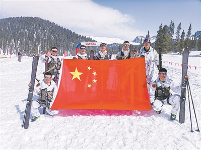 2021年4月,滕家俊(后排右三)参加“国际军事比赛-2021”雪地作战行军项目比赛时,与战友合影。杨再新 摄