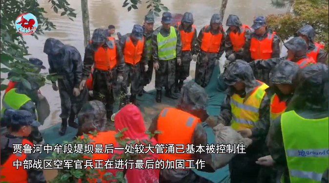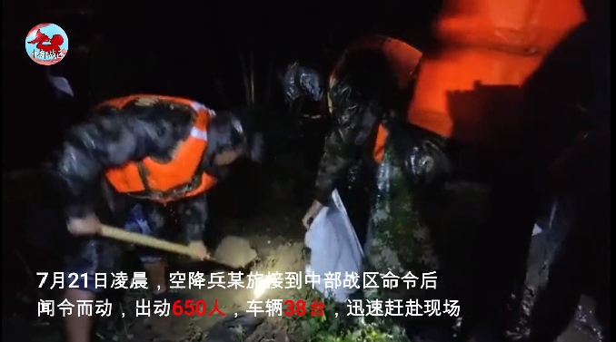 河南省开封市贾鲁河祥符区段的两处决口,情况危急。21日凌晨,空降兵某旅接到中部战区命令,出动650人,车辆38台,迅速赶赴现场,官兵们采用人工和机械相结合方式,筑起长1.5公里、高1.2米的沙袋墙,目前已完成大部分河堤加高任务。