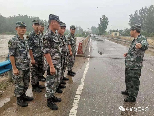 中部战区中将副司令员王长江带抗洪抢险前进指挥所人员,到常庄水库、郭家咀水库勘察灾情,慰问一线官兵,与河南省政府协调对接抗洪抢险需求。(记者:黎璇、尚潮、常延凯)