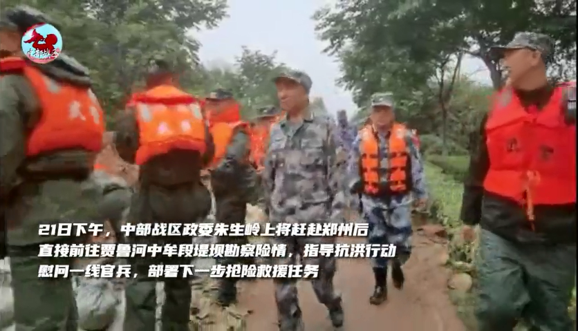 21日,中部战区上将政委朱生岭赶赴郑州,直接前往贾鲁河中牟段堤坝勘察险情,指导抗洪行动,慰问一线官兵,部署下一步抢险救援任务。河南省军区徐元鸿政委介绍相关情况。