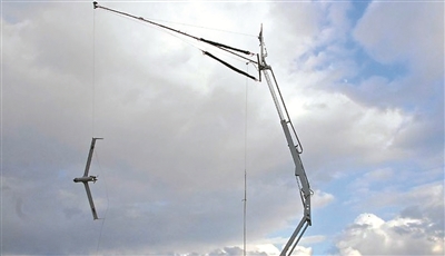 “天钩”回收。这种方式同样是用于中小型固定翼无人机的降落。这种降落方式可视为对撞网回收方式的高度简化,即将拦阻网简化为一根绳索,将数个支架简化为一根高强度的支柱。