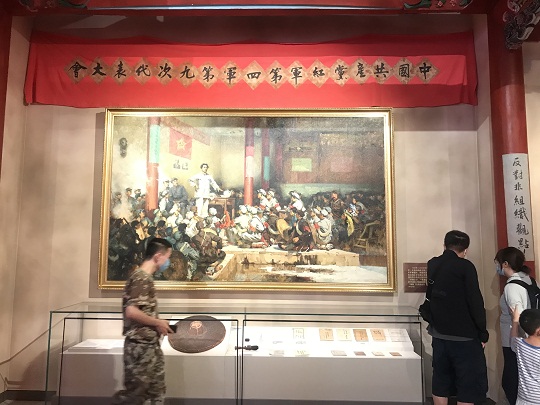 一只掉了搪瓷釉的斑驳质朴的“红菜盘”安静地放在油画《支部建在连上》旁,它是1935年5月11日,毛泽东来到全军第一个建立党支部的连队时用过的餐具。