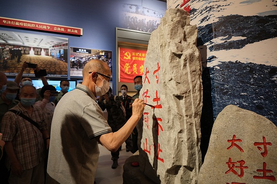展柜里,有太多细节令人感动:王继才去世当日,在开山岛升起的五星红旗;新时代卫国戍边英雄群体的遗物,无声地述说着“大好河山、寸土不让”的铿锵誓言;2020年年初,军队支援湖北医疗队省妇幼保健院光谷院区“党员突击队”旗上密密麻麻的签名;火箭军援鄂医疗队员集体签名的防护服,在展柜灯光的映衬下闪闪发亮……