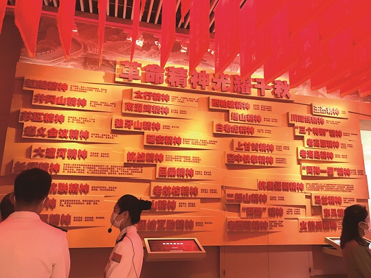 在这面革命精神展墙上,“革命精神光耀千秋 红色基因代代相传”红色大字,向来往的参观者展示着人民军队永不磨灭的红色精神。