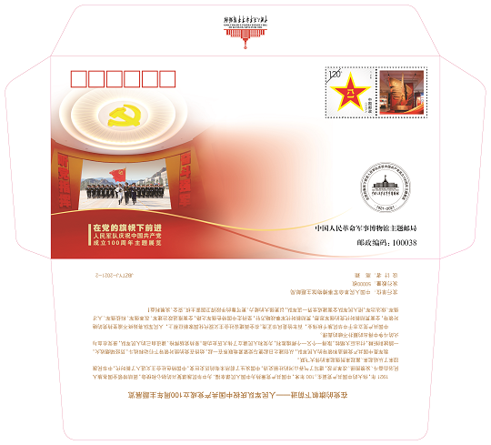 主题邮局开通封主题画面以体现军事特色符号语言的五星为架构图,图内有军事博物馆党领导的革命战争、兵器等基本陈列和纪念中国人民志愿军抗美援朝出国作战70周年、人民军队庆祝中国共产党成立100周年2个主题展览标志性场景,五星架构的中心是军事博物馆馆标,整体表现军事博物馆是展示党领导的人民军队光辉历史和建设成就的革命历史殿堂;主题邮局个性化邮票采用主附票的设计形式,主票以中国人民解放军军徽为主体画面,副票主体画面与开通封的主要元素一致;主题展览纪念封以人民军队庆祝中国共产党成立100周年主题展览序厅为主要元素,配以明朗线条勾画的鲜红旗帜,凸显人民军队在党的旗帜下前进的展览主题。
