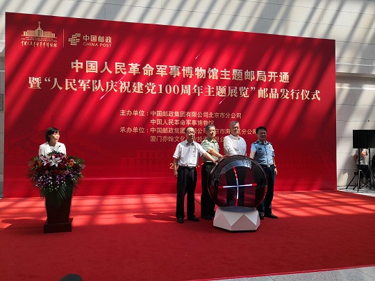 本报北京8月1日讯 记者陈丽平 见习记者韩潇 今天上午,中国人民革命军事博物馆与中国邮政集团有限公司北京市分公司共同举办“中国人民革命军事博物馆主题邮局开通暨人民军队庆祝建党100周年主题展览邮品发行仪式”。中国人民革命军事博物馆馆长李洪军、政委刘锐与中国邮政集团有限公司北京市分公司总经理徐茂君、党委书记张利平共同为军事博物馆主题邮局铭牌揭牌。