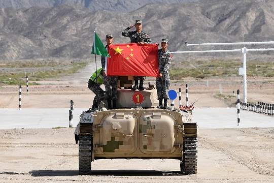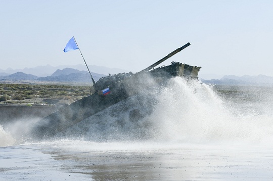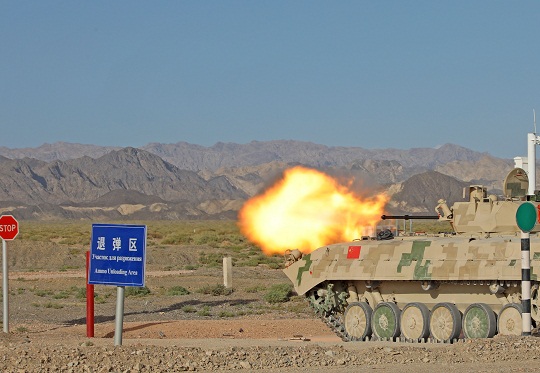 中国车组快速通过机动越障路段后,漂移进入射击阵位,三名参赛队员领弹、装弹一气呵成,随着“砰砰”声响,远方5个随机显示的靶标应声而倒。白俄罗斯车组第四个出场,驶出射击阵位,战车一路飞驰,快速转弯后,加速冲入涉水场,激起数米高的水花。