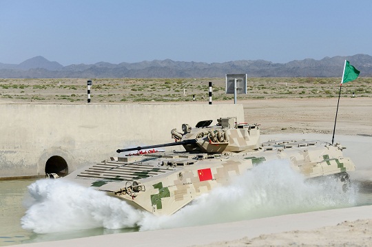 图为中国参赛队员驾驶步战车驶入涉水场。王俊 摄