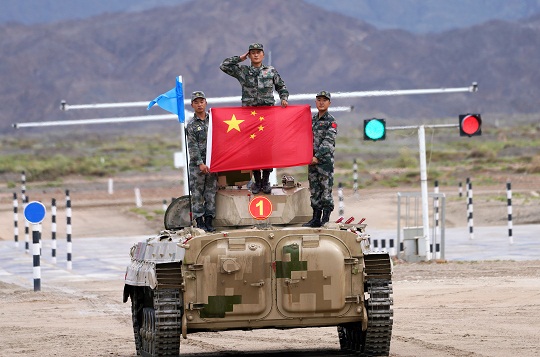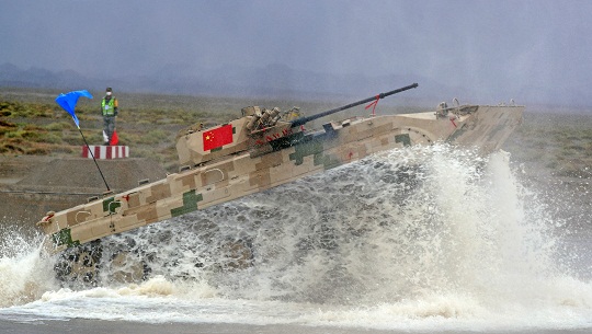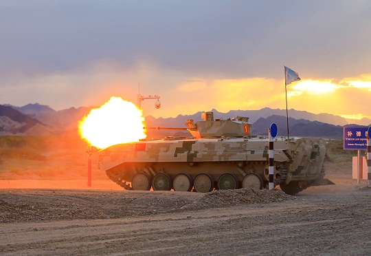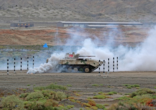 图为中国参赛队驾驶步战车通过烟火路段。罗兴仓 摄