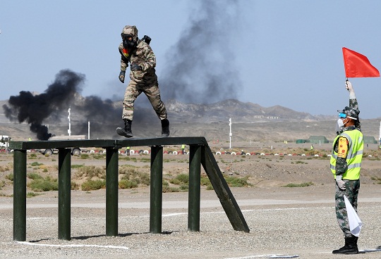 图为“安全环境”项目举行接力赛,中国陆军参赛队队员通过独木桥。 张永进 摄